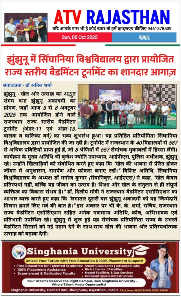 The State-Level Badminton Tournament, inaugurated by Singhania University, kicks off with great enthusiasm in Jhunjhunu October 5, 2025 Anju Gupta 0
