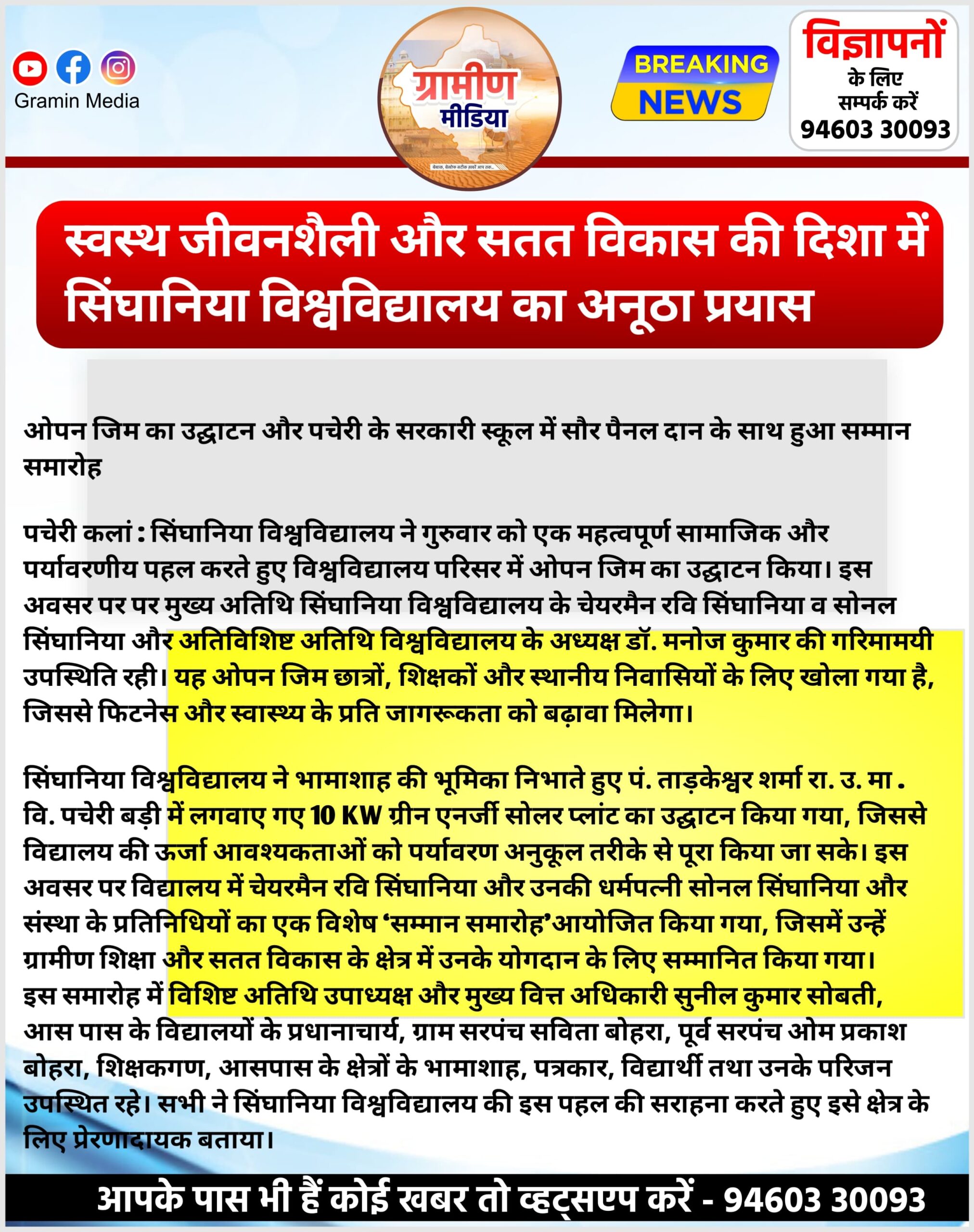 स्वस्थ जीवनशैली और सतत विकास की दिशा में सिंघानिया विश्वविद्यालय का अनूठा प्रयास