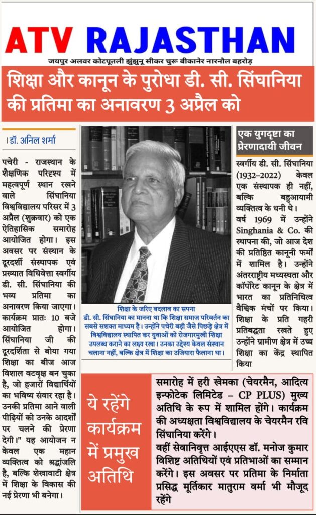• Singhania University will host the unveiling ceremony of the statue of Late Shri D. C. Singhania, a visionary in the fields of education and law